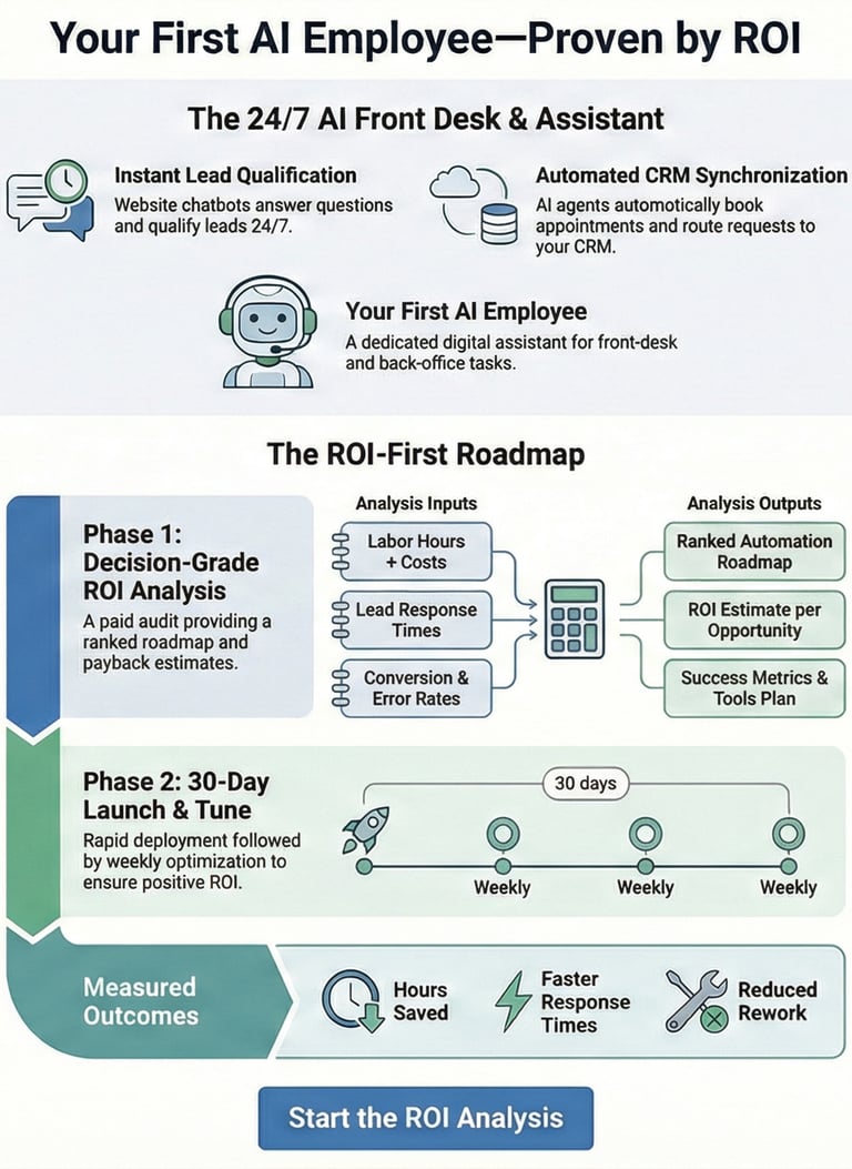 StorenTech builds custom website chatbots and AI agents that connect to your tools (CRM, calendar, email, support inbox, and internal systems) to capture leads, book appointments, and reduce repetitive admin work. We start every engagement with a paid Automation ROI Analysis—mapping your workflows, quantifying time/cost leaks, and estimating ROI using real inputs like labor hours, response time, conversion rate, and error rates. If the numbers make sense, we move into a 30-day ROI Discovery + Implementation phase where we deploy the first automations, track agreed success metrics, and optimize quickly to ensure measurable, positive ROI.